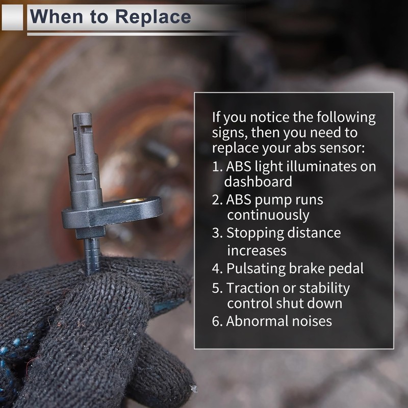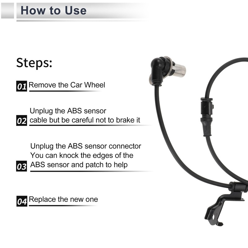 - Installation Steps:Easy Installation.Remove the car wheel, unplug the ABS sensor and sensor connector, then replace the new abs sensor.