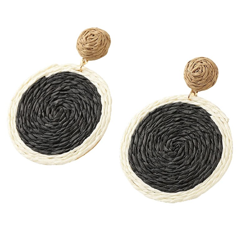 Rattan Earrings Lightweight Boho Colorful Raffia Earrings for Women Handmade Rattan Ball Disc Dangle Drop Earrings Straw Wicker Braid Hoop Earring-black