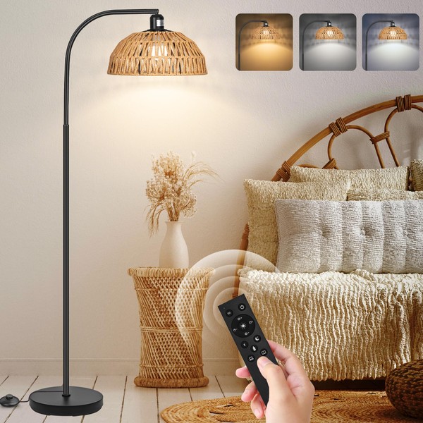 Rattan Floor Lamp- Boho Standing Lamp with Remote Control and Dimmable Bulb, Hand-Worked Adjustable Rattan Shades, Black Farmhouse Tall Lamp, Boho Arc Floor Lamps for Living Room, Bedroom, Office