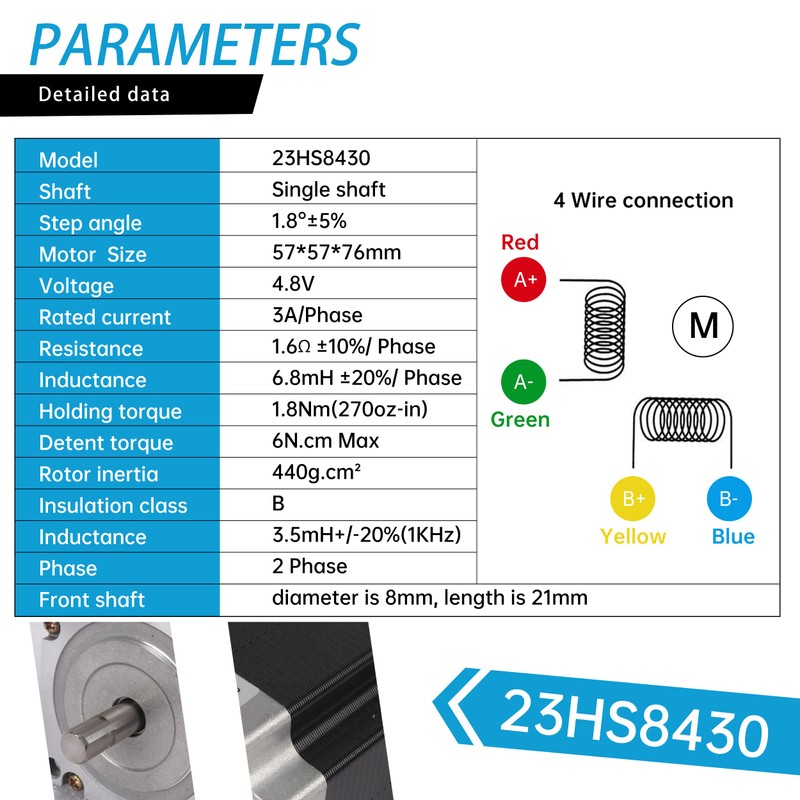 - 【Low Noise/High Torque Hybrid Stepper Motor】23HS8430 2-phase stepper motor with a shaft diameter of 8mm, a current of 3A and an angle of 1.8°, is made of durable metal on the outside, and the perfect combination of rubber and rotor fills up the inner space and stabilizes the overall structure of the motor. The coils are made of pure copper enameled wire and the torque is up to 270oz-in (180N.cm/18kg-cm). The motor runs quietly and doesn't cause the generator to become too hot over a long time.