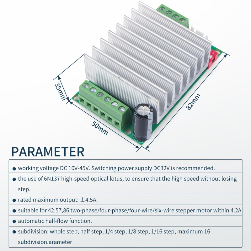 - 【Upgraded 4.5A Stepper Motor Driver】Using the latest TB6600 new installation chip, there are low-voltage shutdown, thermal over-stop and over-current circuit protection, and compared with the TB6560 increased short-circuit protection. TB6600 driver operating voltage of DC 10-45VDC, support for sub-division of the whole step, half-step, 1/4, 1/8, 1/16 step, up to 42/57/86 two-phase / four-phase / four-wire / six-wire stepper motors within 4.2A. / six-wire stepper motor.
