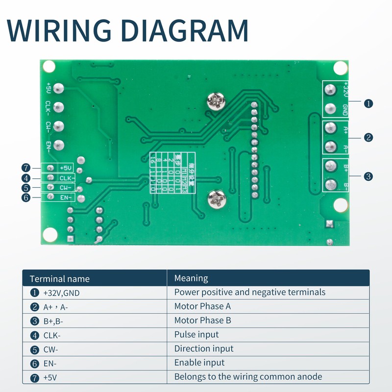 - 【Motor and TB6600 Driver wiring】Stepper motor's RED wire connects to driver's A+ port. Stepper motor's GREEN wire connects to driver's A- port. Stepper motor's YELLOW wire connects to driver's B+ port. Stepper motor's BLUE wire connects to driver's B- port.