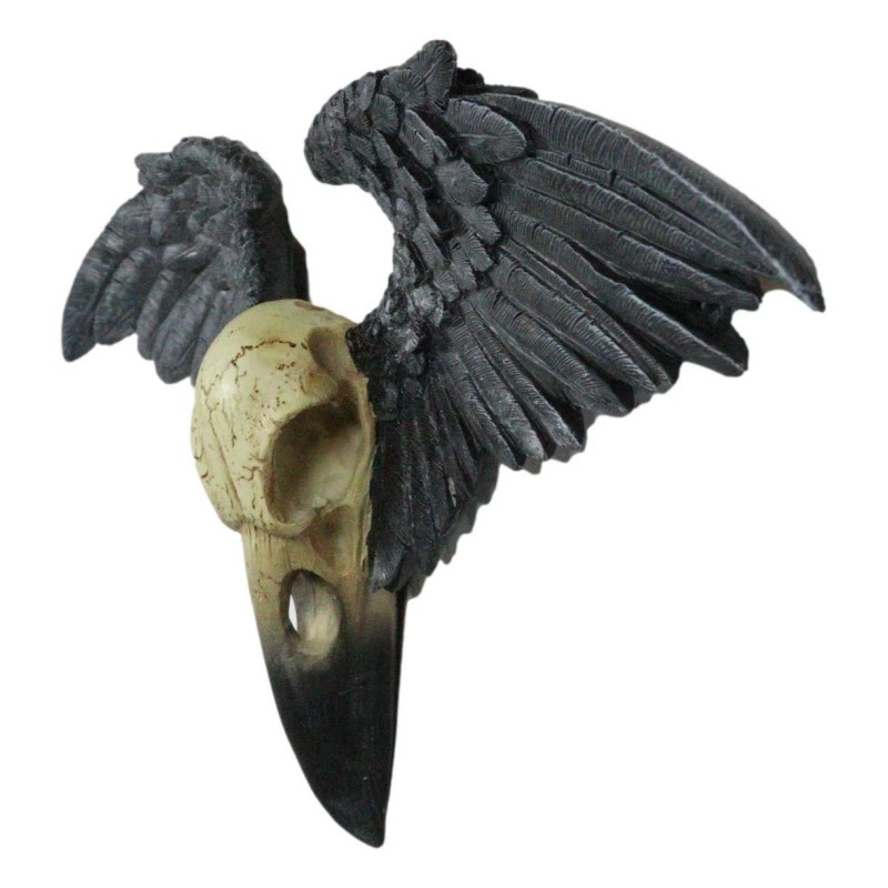• This Corvus Angel Of Death Raven Skull Wall Decor measures 5.25" High, 10.25" Wide and 1.5" Deep approximately. It weighs about 9 ounces.