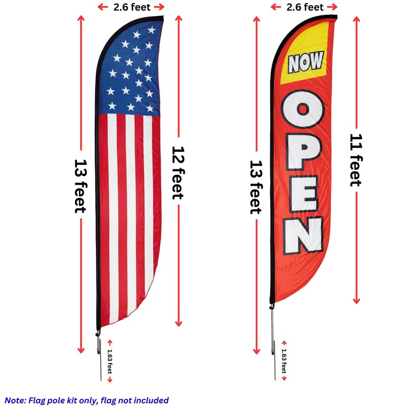 Our feather flag pole will get your business noticed by everyone passing by! have a 12 ft, 10ft, or even 8ft flag? Get our patent pending flag pole. The flag size is flexible and fits 8-13 ft flags. It's the easiest to set up, the most portable, and reinforced to resist high winds.