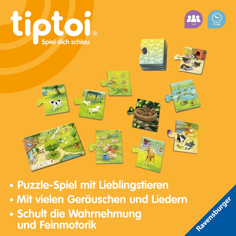 • Together with tiptoi, small animal fans from 2 years of age immerse themselves in the world of cute animal children. Loving illustrations, authentic animal sounds and fun songs make the wildlife come alive.
