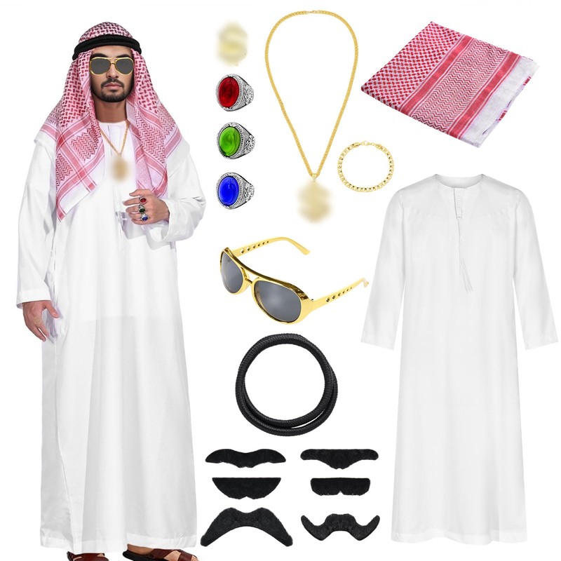 - Fancy Dress Costumes for Men This sheikh costume set for men includes 1 x white robe, 1 x red and white plaid headband, 1 x sunglasses, 3 x jewellery rings, 1 x gold ring, 1 x gold chain, 1 x gold bracelet, 1 x black headband and 6 x beard supports. Lots of costume accessories to match your costume.
