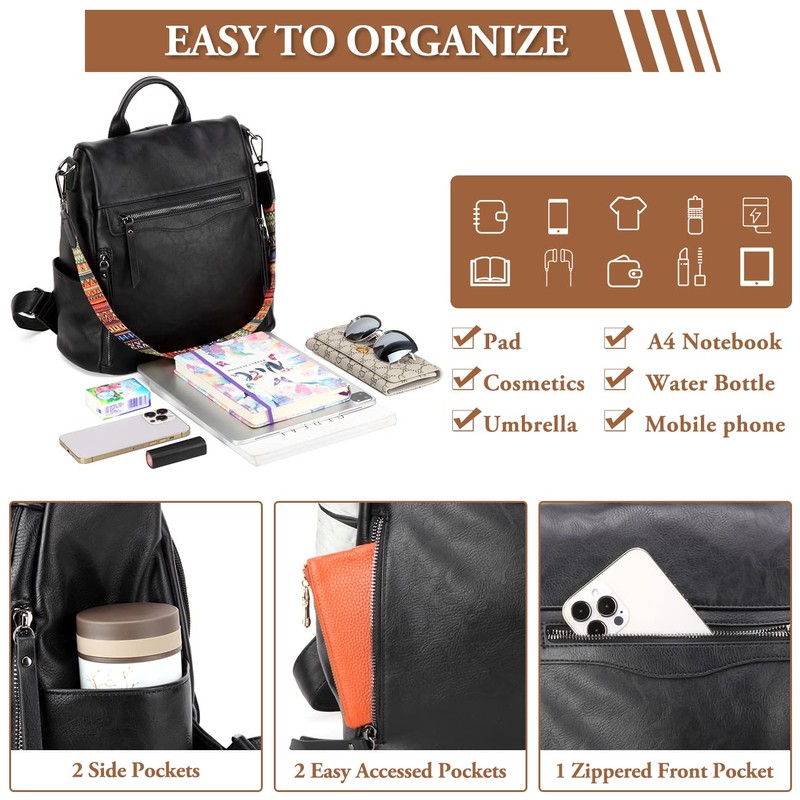 - ✿ANTI-THEFT DESIGN:RAVUO practical leather backpack designs with back zipper closure, effective anti-theft design which keeps your belongings safe.The anti theft backpack features top handle, a detachable shoulder strap and adjustable back straps,you can carry it in 3 ways as a purse,shoulder bag and backpack for any occasion.This cute and designer woman backpack fits for shopping,traveling,working,dating.