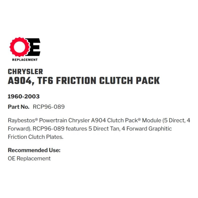 Raybestos® Powertrain Chrysler A904 Clutch Pack® Module (5 Direct, 4 Forward). RCP96-089 features 5 Direct Tan, 4 Forward Graphitic Friction Clutch Plates.