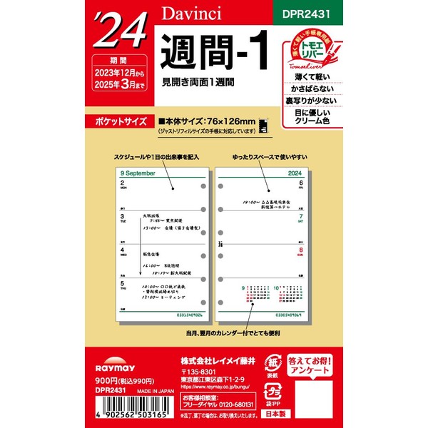 Raymei Fujii DPR2431 Personal Notebook, Refill, 2024, Pocket Size, 1 Weekly, Starts December 2023