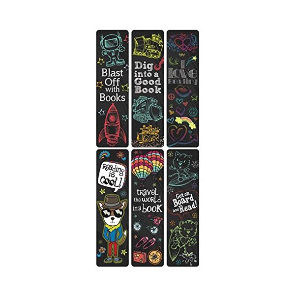 • Bright Colors: These bookmarks for kids come in 6 designs: I Love Reading, Dig into a Good Book, Travel the World in a Book, Reading is Cool, Get on Board and Read! and Blast Off with Books