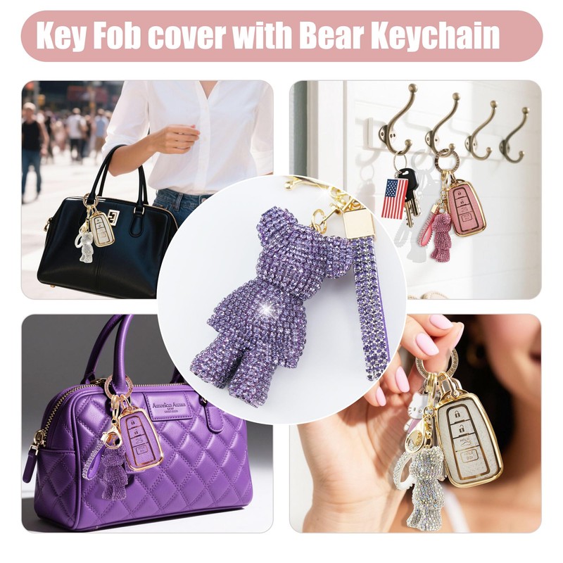 - [Elegant & Sparkly] Designed for fashion-forward drivers, this snowflake-textured key fob cover in gold and purple pairs beautifully with a rhinestone bear charm — stylish, shiny, and irresistibly cute.