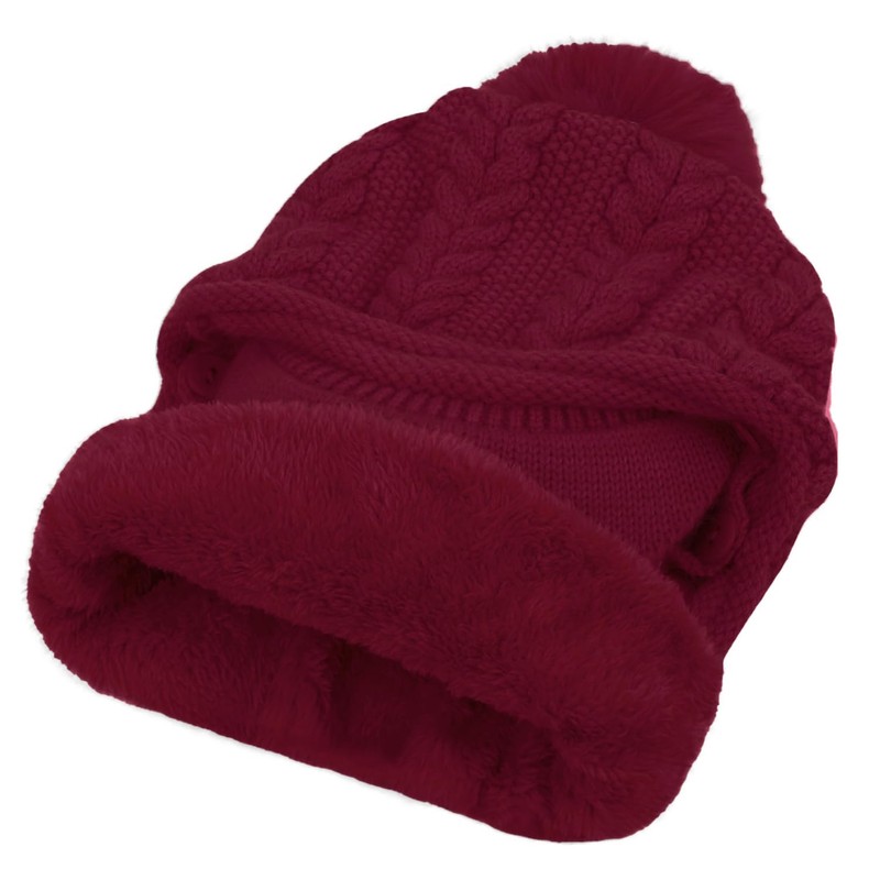Rayson Winter Thickened Lining Hat for Women Thermal Balaclava Hood Scarf with Visor Knitted Winter Caps for Women with Pom Pom(Burgundy,One Size)