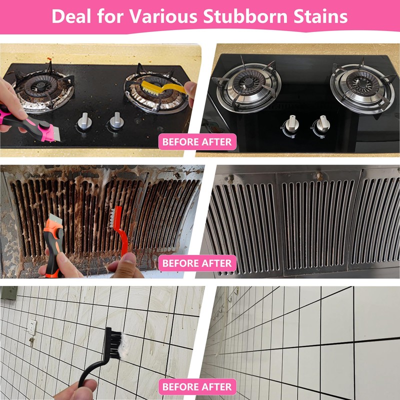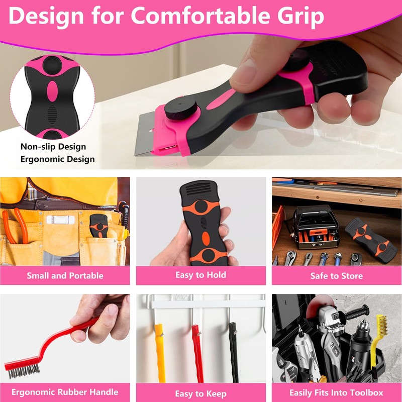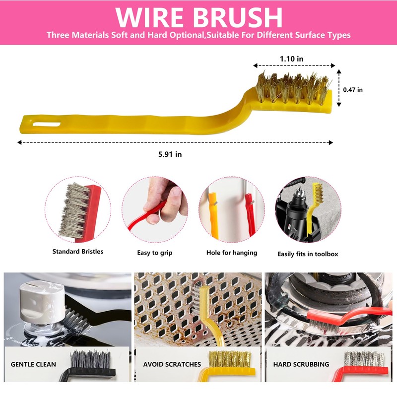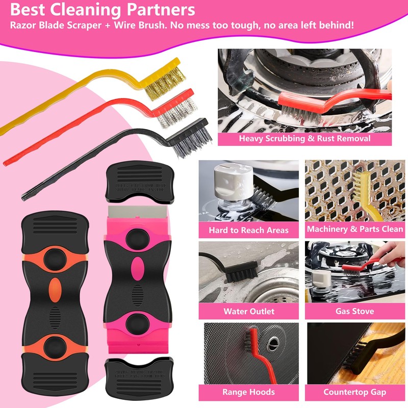 - 【Ergonomic Design for Comfort and Control】 Both our plastic razor blade scraper and wire brushes feature ergonomic designs that enhance usability. The plastic scraper tool has anti-slip handles for a comfortable grip, making cleaning tasks easier. Meanwhile, the small wire brushes come with soft rubber-covered handles and water chestnut grips for added comfort. Plus, their perforated ends make them easy to organize and store.