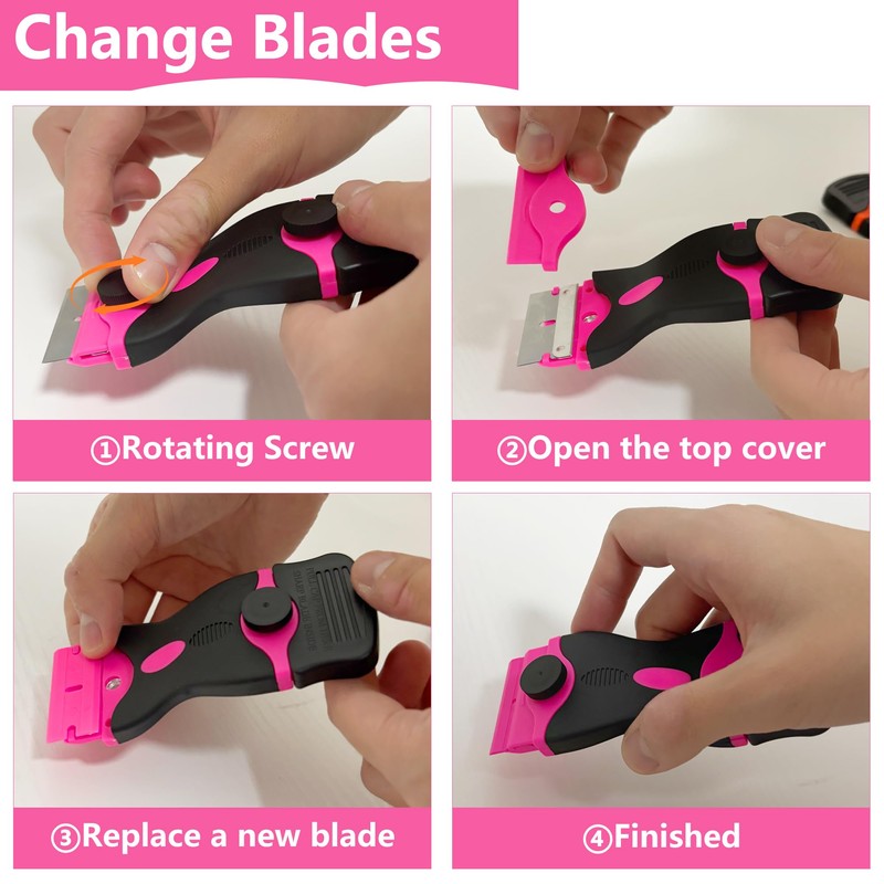 - 【Easy to Use and Safe Cleaning Scraper】 This razor blade scraper is designed for easy use. Simply loosen the knob on the scraper and remove the top cover to effortlessly replace the blade. We recommend taking extra care when replacing the metal blade for safety. Additionally, the safety knobs on both sides of the scraper provide stability, and the double-ended scraper comes with protective covers for convenient storage, preventing accidental cuts. Whether in use or storage, this tool offers a safe and user-friendly experience.
