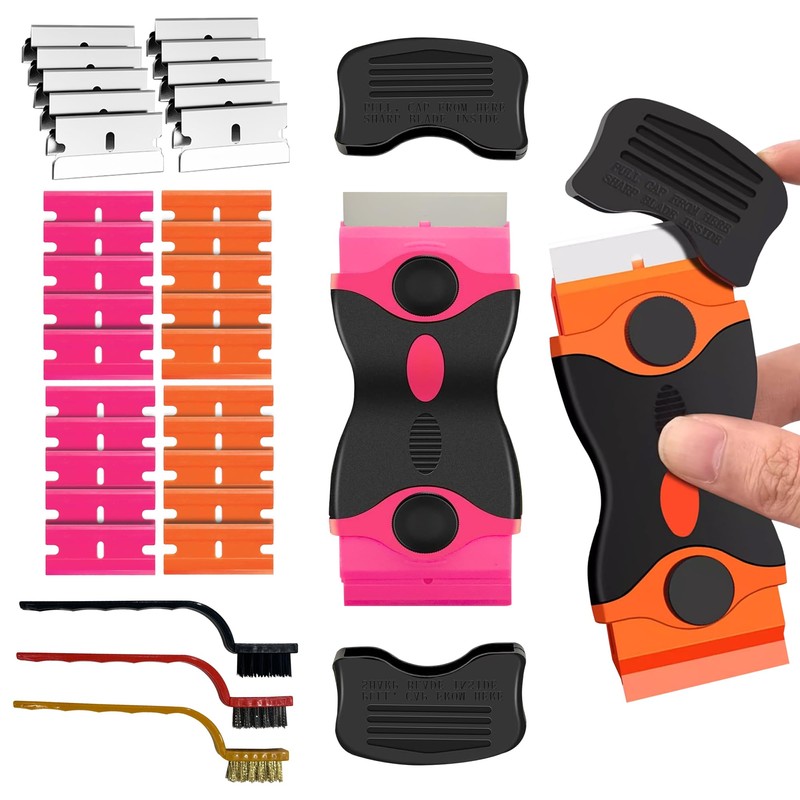 - 【Pack of 5 Razor Scraper Tools】 This pack includes two dual-head plastic scrapers, designed for versatility in various cleaning tasks. Additionally, it features three wire brushes for different applications and a total of 50 blades, ensuring you have everything you need for effective cleaning. *Caution: There are sharp blades inside. Handle with care and keep out of reach of children.