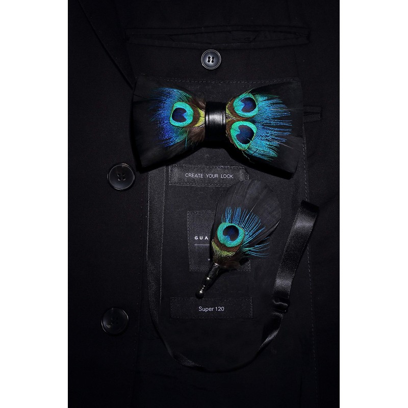 RBOCOTT Mens Handmade Feather Pre-tied Bow tie and Brooch Sets (peacock blue/black)