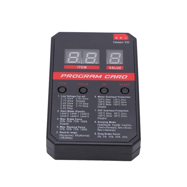 - Easy to Operate: Insert the ESC directly into the programming card, and then select the desired program.