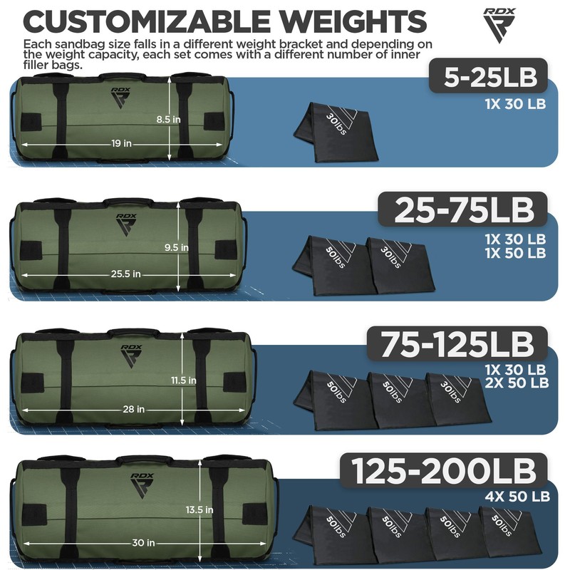 - PHENOMENAL STRENGTH TRAINING Decided to make fitness a lifelong dedication? RDX introduces the exclusive workout sandbag that is intelligently designed with exceptional endurance and matchless durability, flexibility, and maneuverability. Shrug off those excuses with the fitness power bag and indulge in boosting your physical toughness while training for squats, shoulder presses, reverse lunges, side lunges, pullovers, and many more. PLEASE NOTE THE SANDBAG COMES UNFILLED.