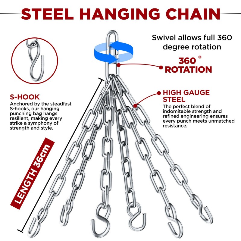 - 6-WAY DYNAMIC EQUILIBRIUM – Experience unmatched equilibrium during your sessions with our unfilled angle punch bag. Featuring 6 cross-stitched and riveted straps, along with robust powder-coated D rings, stability is a given. The cutting-edge 6-strand stainless steel chain with an integrated swivel promises consistent balance in every workout. Plus, with the 2-inch layer of unyielding Maya hide leather, this punching bag is built for exceptional impact diffusion