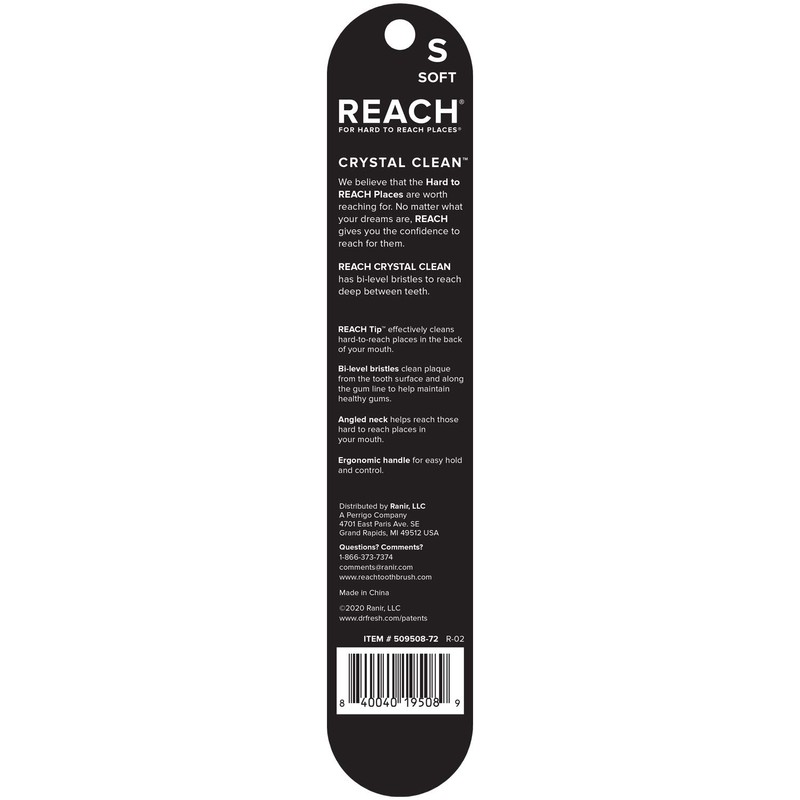 Reach Crystal clean toothbrushes are scientifically designed with a signature angled neck and cleaning tip to remove plaque from hard to Reach places like the back of your mouth. These toothbrushes also feature bi-level bristles that clean plaque from the tooth surface and along the gum line, helping to maintain healthy gums.