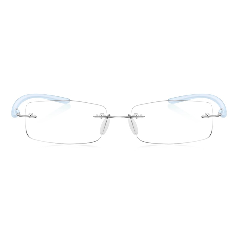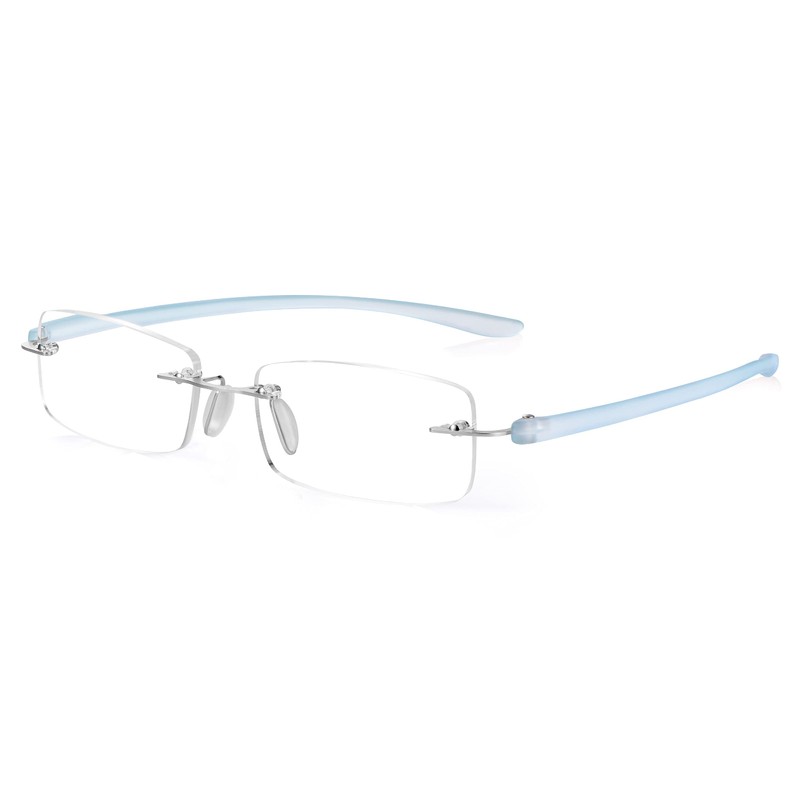 - Unisex design. Glasses that fit most face shapes. Since they do not have a frame on the front, these glasses are perfect for customers who want less visible glasses. Ultra-thin bridge and side frame in stainless steel silver with high-quality plastic brackets in light blue matt.