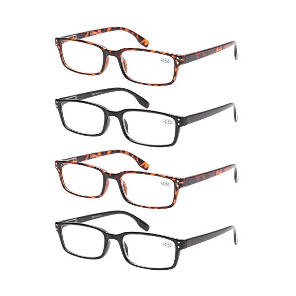 READING GLASSES 4 Pack Spring Hinge Comfort Readers Plastic Includes Sun Readers, 2 Black 2 Tortoise, Medium