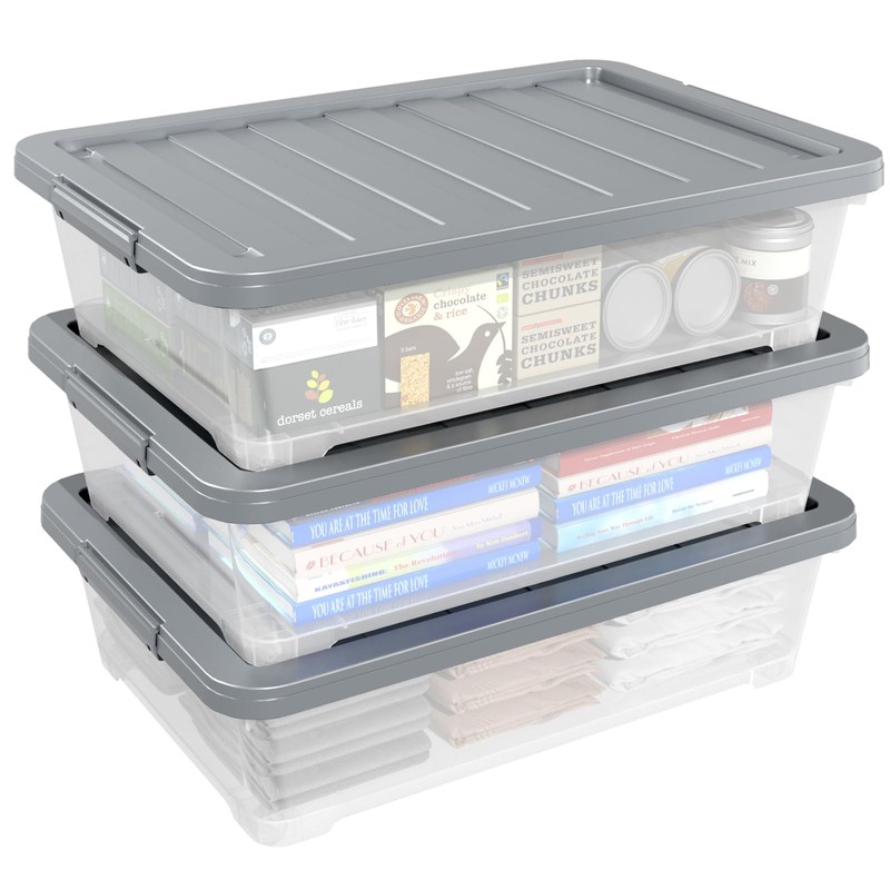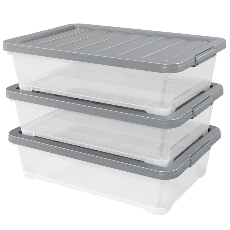 Readsky 3 Packs Large Clear Wheeled Latching Box, 40 L Plastic Underbed Storage Box with Gray Lid