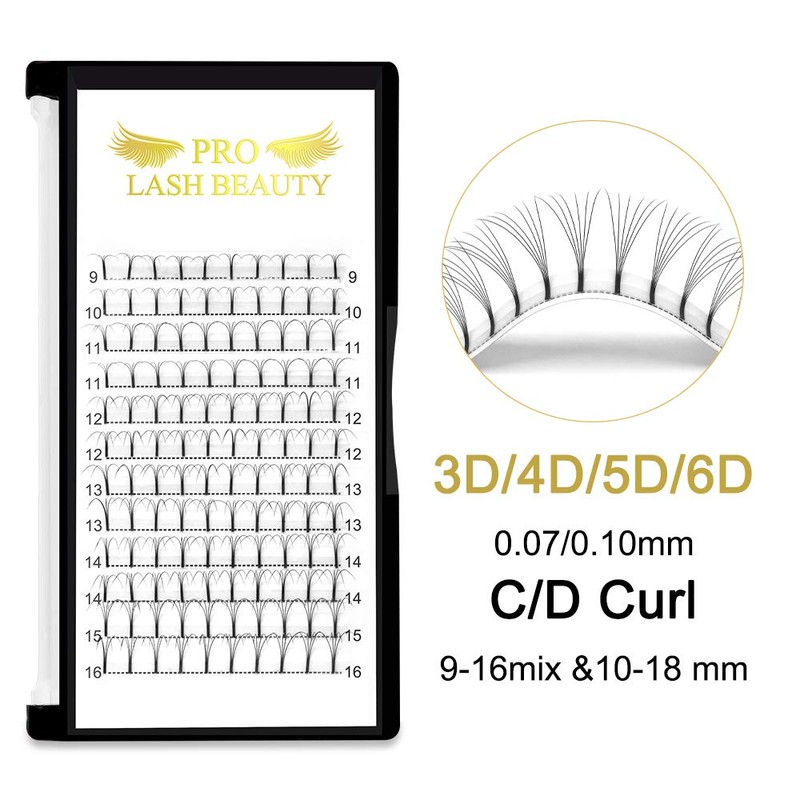 - Specifications and material: Pre-made compartment eyelash extensions have 120 compartments per compartment. Available in 3D, 4D, 5D, 6D, 0.07/0.10, C and D curl, 9 to 20 mm length. Pre-made volume eyelash extensions are black PBT (Polybutylene Terephthalate) material, which is durable and can withstand high temperatures. They are very soft and lightweight.