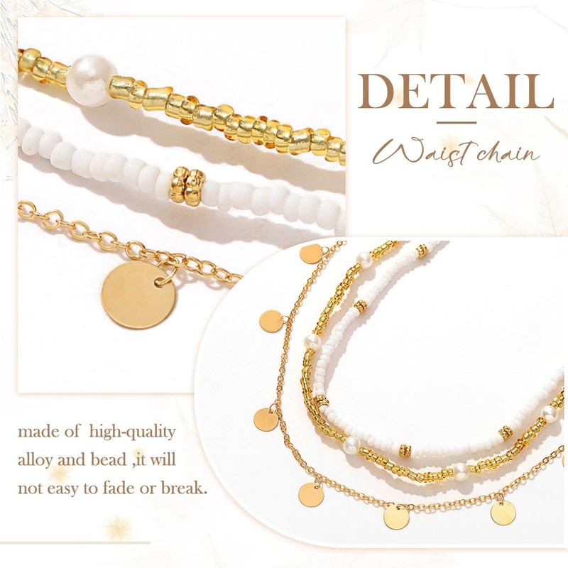 Reaky Boho Layered Sequins Waist Belly Chains Gold Beaded Waist Chain 3 Pcs Pearl Body Chains for Women