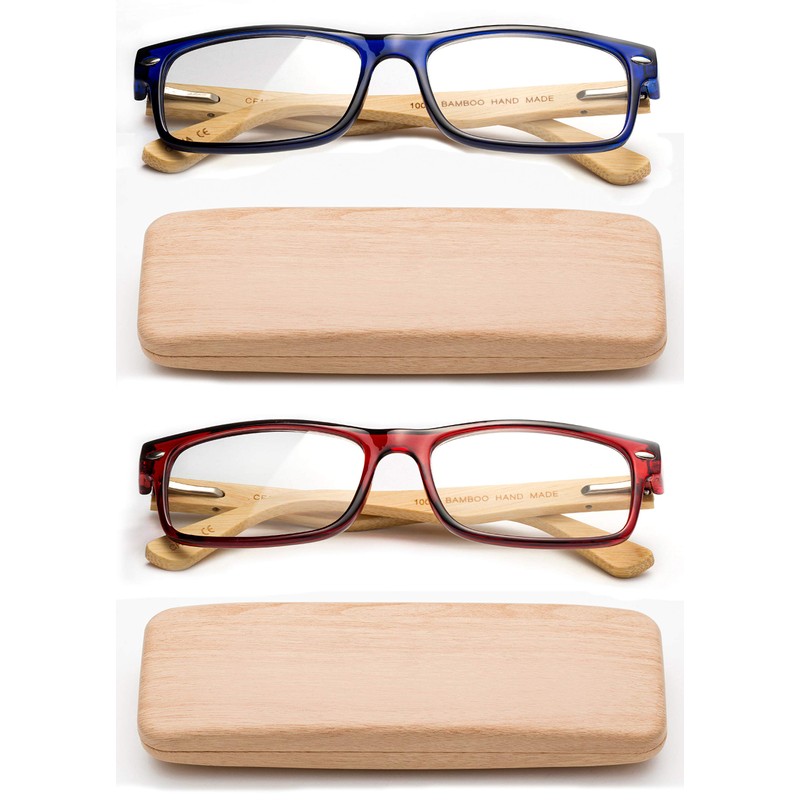 Real Bamboo Reading Glasses Spring Hinge Genuine Bamboo Rectangular Reader w/Case