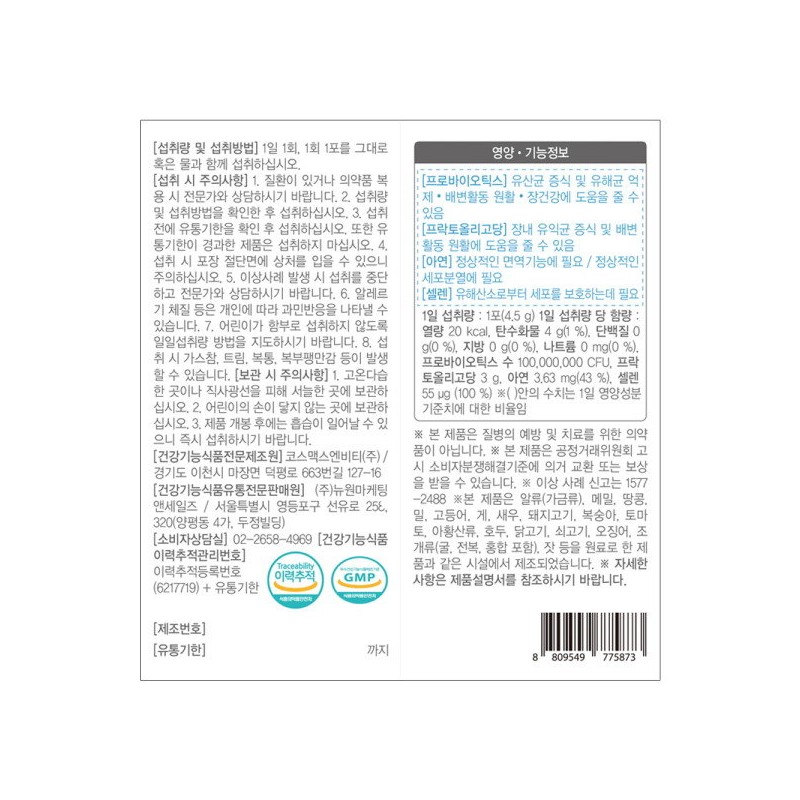 - Nutrition information: Per daily intake: Calories 20 kcal, carbohydrates 4 g (1%), protein 0 g (0%), fat 0 g (0%), sodium 0 mg (0%) Number of probiotics: 100,000,000 CFU Fructo-oligosaccharides: 3 g zinc : 3.63mg selenium: 55㎍ ( ) is the ratio of the daily nutrient standard value