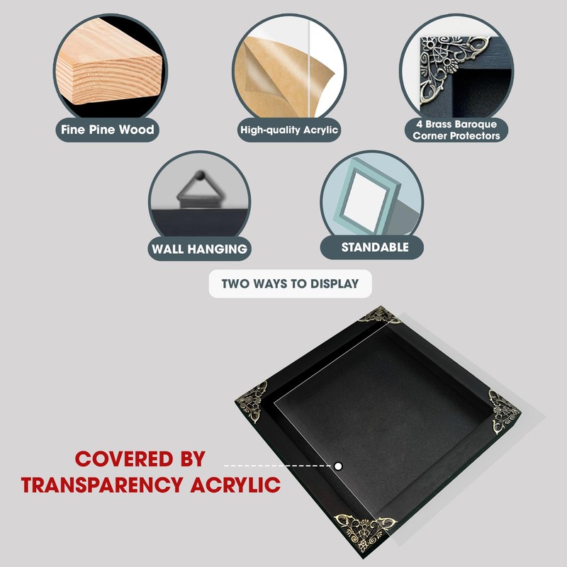 - FRAME SIZE: 6.3 x 6.3 x 1.2 inch ( = 16 x 16 x 3 cm). The frame was made of pine wood covered by 3 layers of paint coming with a special acrylic on the front to give a clear view, 4 brass baroque corner protectors in the corner, and a hanger hook on the back and ready to hang.