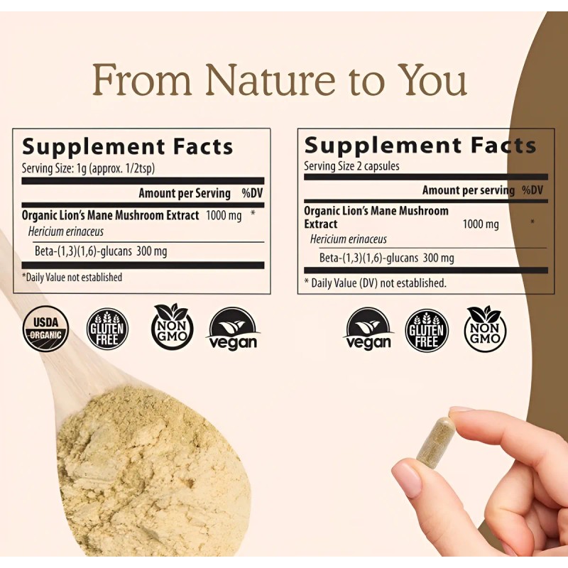 - Suplemento de seta de melena de león para una mejor salud cognitiva: Hecho de extracto de hongo de melena de león real, utilizamos extracción de agua caliente para obtener beta