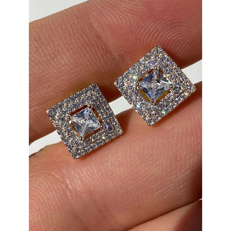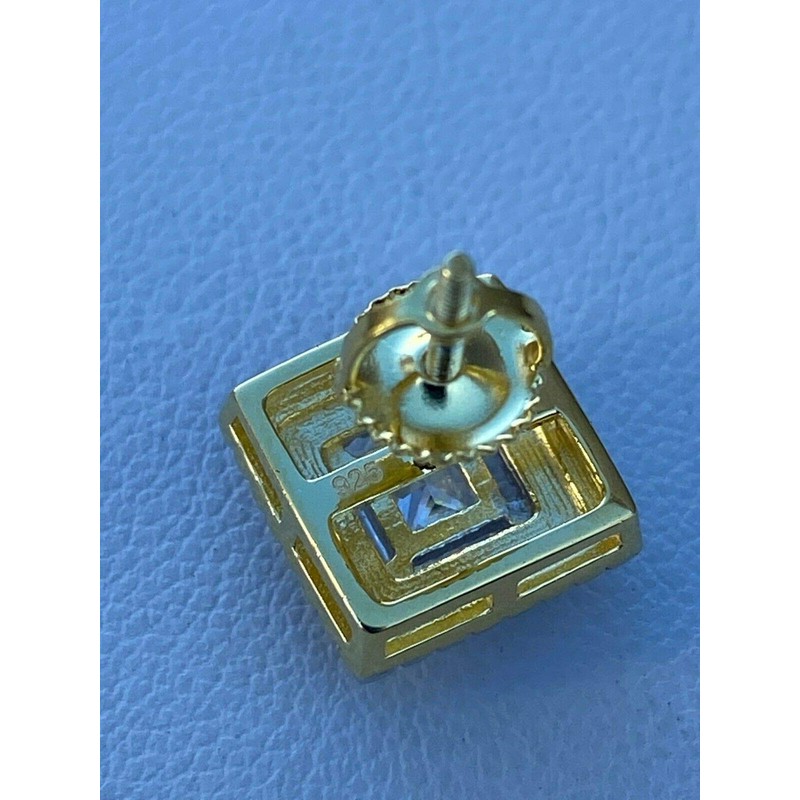 Real Solid 925 Sterling Silver 14k Gold -Square Baguette Kite Earrings - Iced CZ 10mm (3/8") Earrings Screw Backs - Flooded Out Aretes