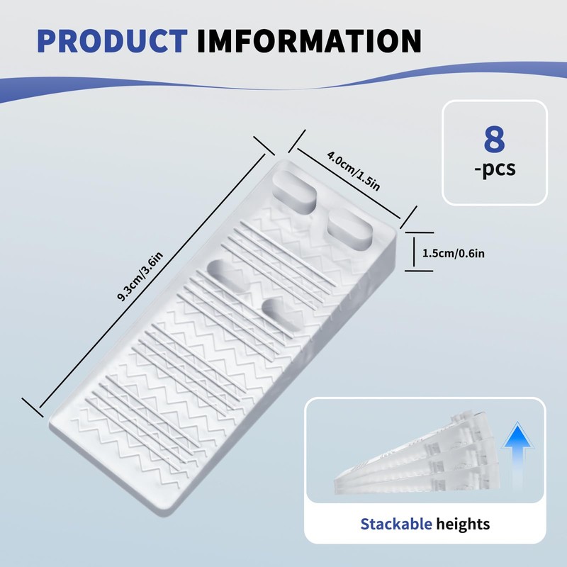 - SIZE & QUANTITY 8 table wedges, each measuring 9.3 cm long, 4 cm wide, 1.5 cm high on the higher side and 0.3 cm high on the bottom. You can cut or cut the toilet discs for levelling so they always fit perfectly