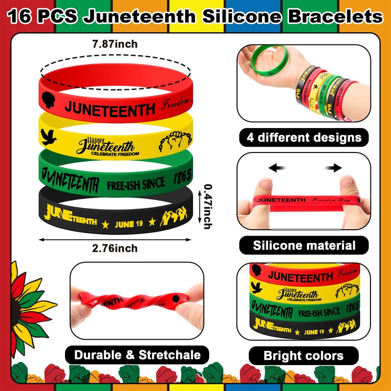 - Package Included: you will receive 16 different styles of Juneteenth silicone rubber bracelets, featuring 4 designs with 4 pieces each, and 16 Juneteenth cosmetic bags, featuring 8 designs with 2 pieces each; These products are practical and suitable for everyday and holiday applied, with sufficient quantities, making them ideal for parties and celebrations