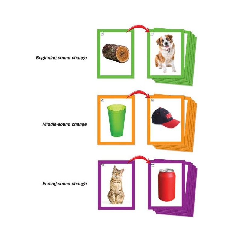 • COLOR-CODED CARDS FOR SOUND POSITION: The 46 Photo Cards have outside borders that are color-coded for sound position with green for beginning-sound change, orange for middle-sound change, and purple