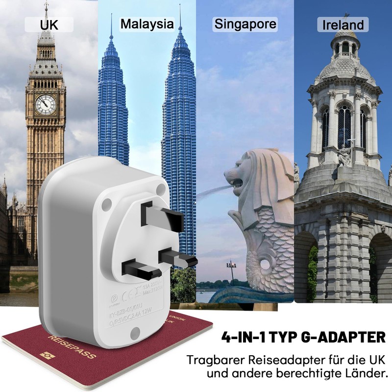 - Travel adapter type G: Our UK socket adapter is designed to connect 2 pin German EU Schuko to 3 pin UK plug (13A, 250V, max. 3120W), ideal for travelling to the UK, Ireland, Scotland, Maldives, Hong Kong, Singapore, Malaysia, Indonesia, Dubai, Saudi Arabia, Pakistan, Zambia, Mauritius and many other countries.