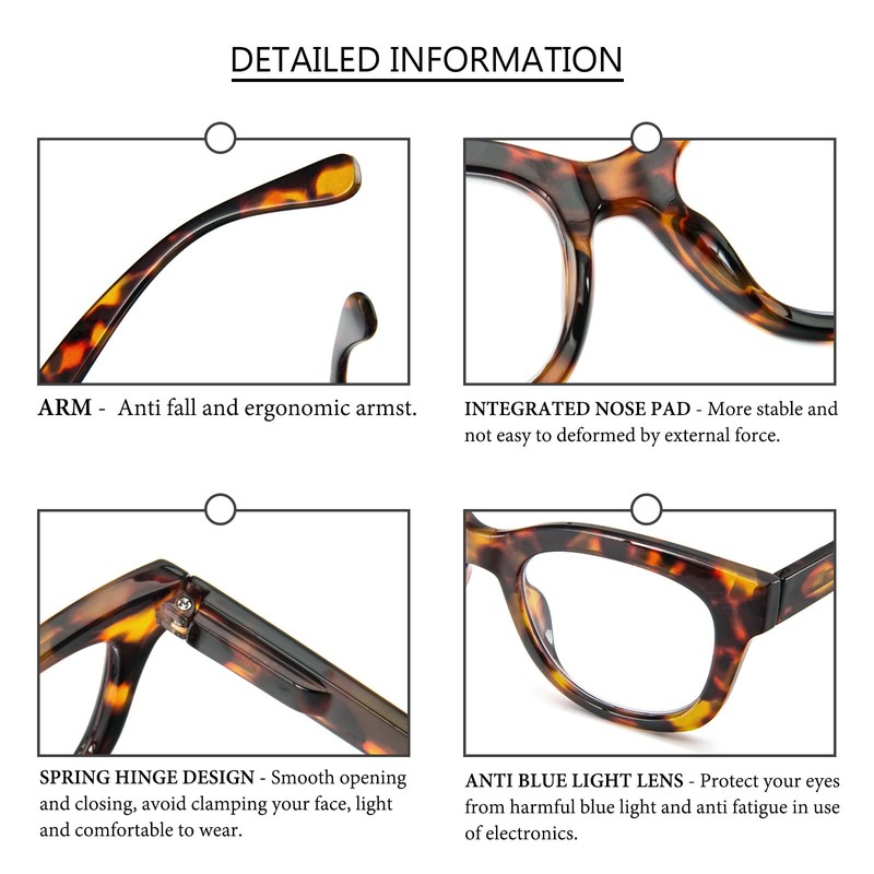 • Lady's Fashion Reading Glasses: Well-designed reading glasses, focusing on fashionable appearance, can be perfectly matched with various face shapes. With our eyeglasses set, you will have multiple pairs of eyeglasses to different clothes, making you more attractive!