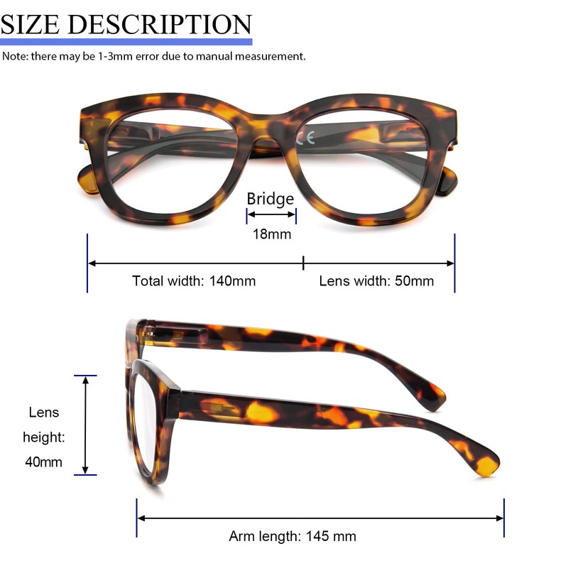 • Dimension: Lens width: 1.97" (50mm), Lens height: 1.57" (40mm),Bridge: 0.71" (18mm),Frame width: 5.5" (140mm),Temple length: 5.75"(145mm).