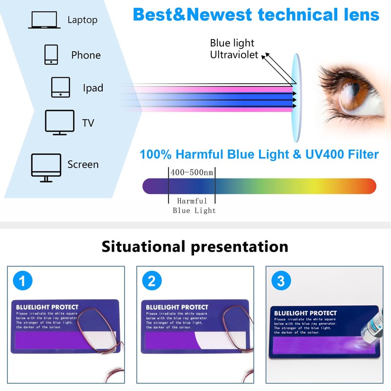 • Anti blue light lens: Wearing anti blue light glasses will protect your eyes from the harmful blue light, relieve eye fatigue and discomfort especially when watching TV and working under fluorescent lights.A pair of blue light blocking glasses is essential for heavy computer and mobile phone users.