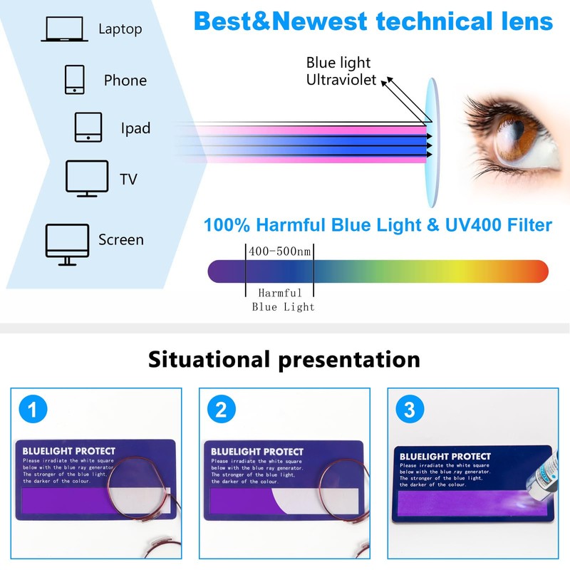 - Anti blue light lens: Wearing anti blue light glasses will protect your eyes from the harmful blue light, relieve eye fatigue and discomfort especially when watching TV and working under fluorescent lights.A pair of blue light blocking glasses is essential for heavy computer and mobile phone users.