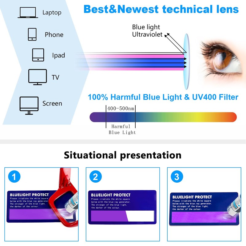 - Anti Blue Light Glasse: Blue light blocking lenses with UV400 protection block harmful blue light, reducing exposure to blue light from digital electronics and reading.