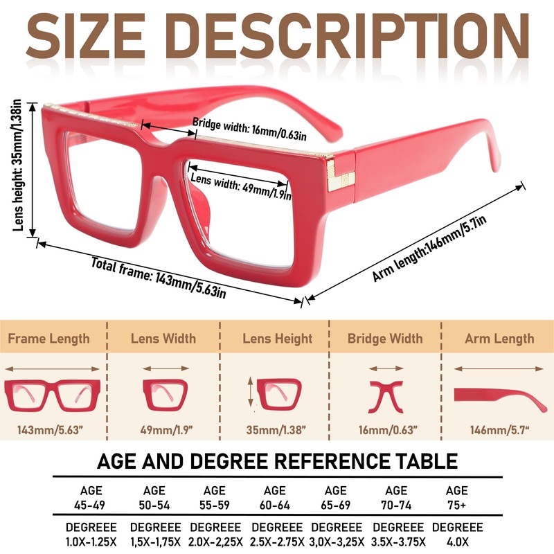 - Fashion Reading Glasses: Cute square reading glasses, created by designers are more suitable for people who loves fashion. A variety of different colors to choose, showing a more different you. Whether you're walking down the street, work, or read, this design will make you more attractive.