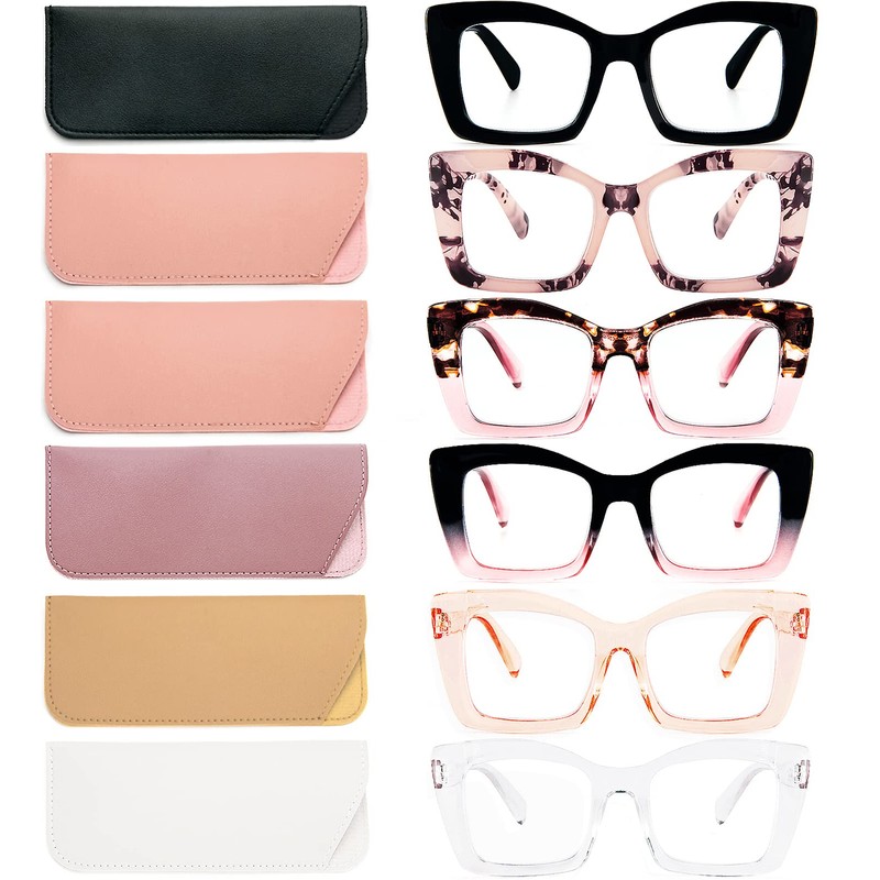 REAVEE 6 Pack Oversized Square Reading Glasses Oprah Style for Women, Blue Light Blocking Large Frame Computer Designer Fashion Readers Spring Hinge with Leather Case,1.0