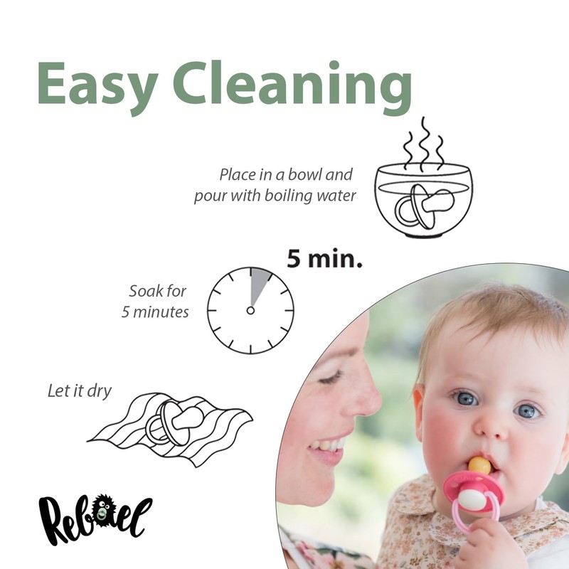 - The Rebael dummy has a cherry-shaped teat and a round shield, the material is 100% healthy and without harmful substances