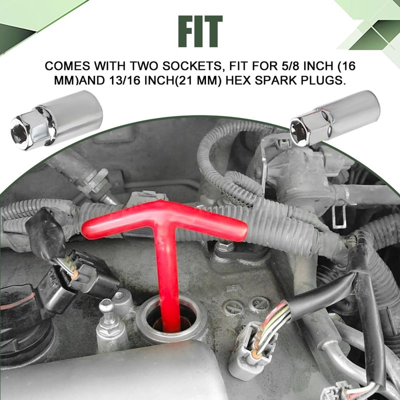 - [Scope of use] : Contains a T-shaped handle, a 5/8 inch (16 mm) spark plug socket and a 13/16 inch (21 mm) spark plug socket for spark plug installation/removal in most cars, trucks, vans, motorcycles and lawn mowers, Please check the size information before purchasing to see if your vehicle spark plug matches