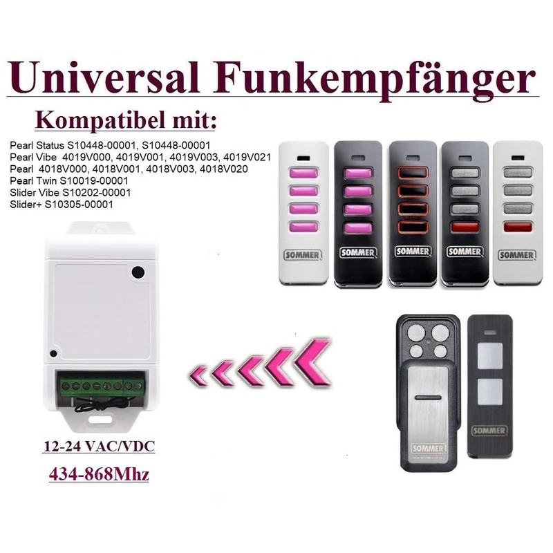 This receiver is compatible with the following Summer 868MHz remote controls: Sommer 4020, 4026, 4031, 4011, Aperto 4025 4035, Pearl Status S10448-00001, S10448-00012; Pearl Vibe 4019V000, 4019 V001, 4019V003, 4019V021; Pearl 4018V000, 4018V001, 4018V003, 4018V020; Pearl Twin S10019-00001, Slider Vibe S10202-00001, Slider+ S103 05-0000001