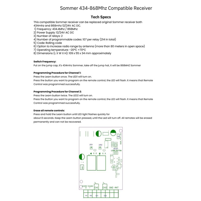 Receiver Compatible with Sommer Pearl Twin S10019-00001, Slider Vibe S10202-00001, Slider+ S10305-00001 Remote Controls 2-Channel 434-868Mhz 12-24 VAC/DC Radio Receiver