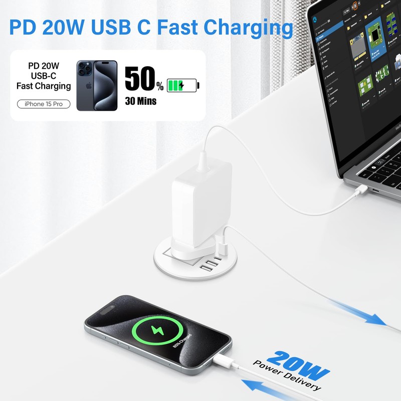 Recessed Power Socket with 1 UK Plug, 20W Fast Charging USB-C Port, Desk Power Grommet 80mm, Seamless Flush Mount - Make your desktop tidier, Workspace Essential Desk Socket (White)